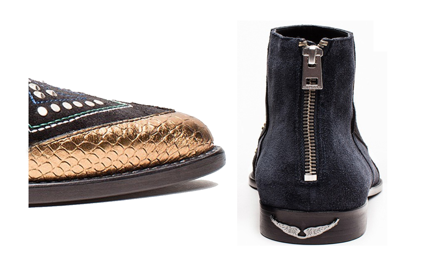 Much like raccoons, I like sparkly things.  Even better when they are attached to things I can wear.  I do this a lot, clearly, with #Brose.  But Zadig & Voltaire does it differently, and in the case of these ankle-cow-boy-booties — made with a whole bunch of other stuff (metal wings, suede patches gold metal back zips, snake embossing) — my rule still feels good.  Really good.